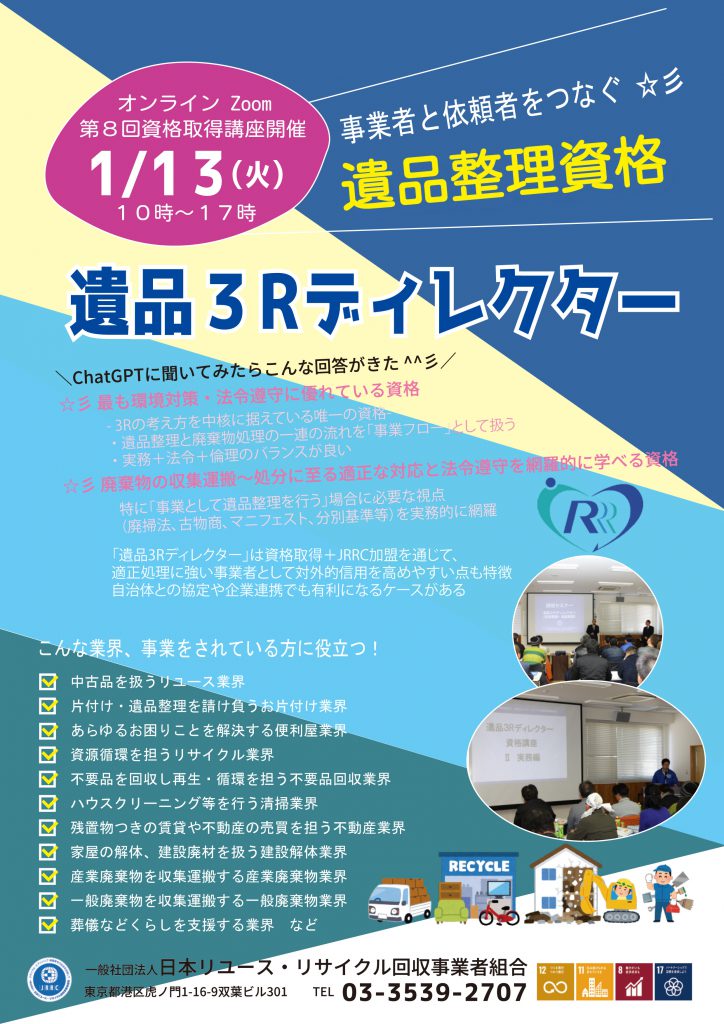 一般社団法人日本リユース・リサイクル回収事業者組合(JRRC)が事業者を対象に展開する遺品整理資格『遺品3Rディレクター』の講座が2026年1月13日(火)にZoomを使ったウェビナーで開催されます。