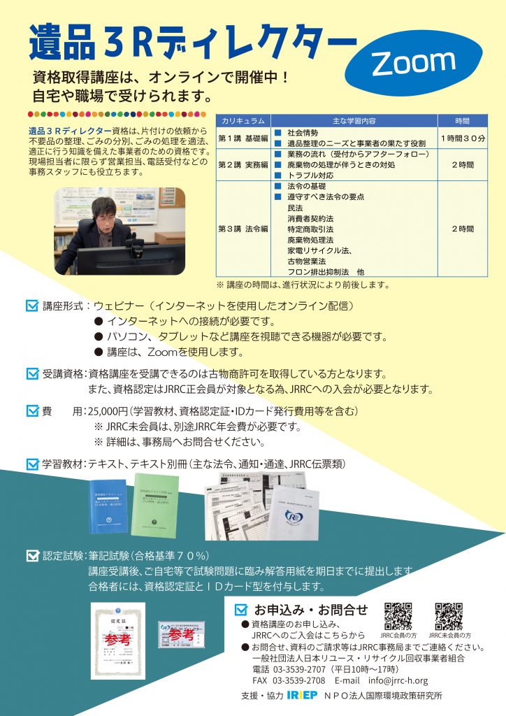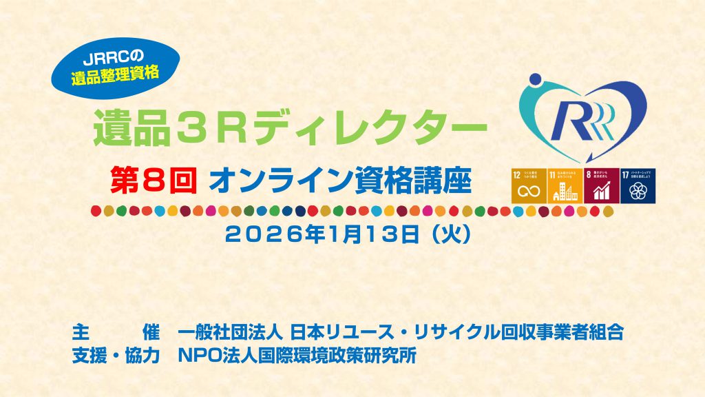 一般社団法人日本リユース・リサイクル回収事業者組合(JRRC)が事業者を対象に展開する遺品整理資格『遺品3Rディレクター』の講座が2026年1月13日(火)にZoomを使ったウェビナーで開催されます。